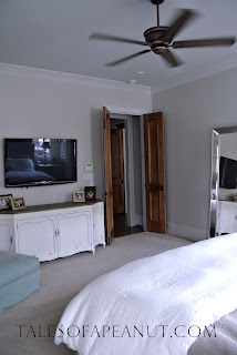 We love our room and feel like it is perfect for us. It's light and airy and warm without too much pattern or "frou frou". We, obviously, still need to hang some things on the wall, but instead of just putting something that we kind of like up there, we're waiting to find something that we love.
